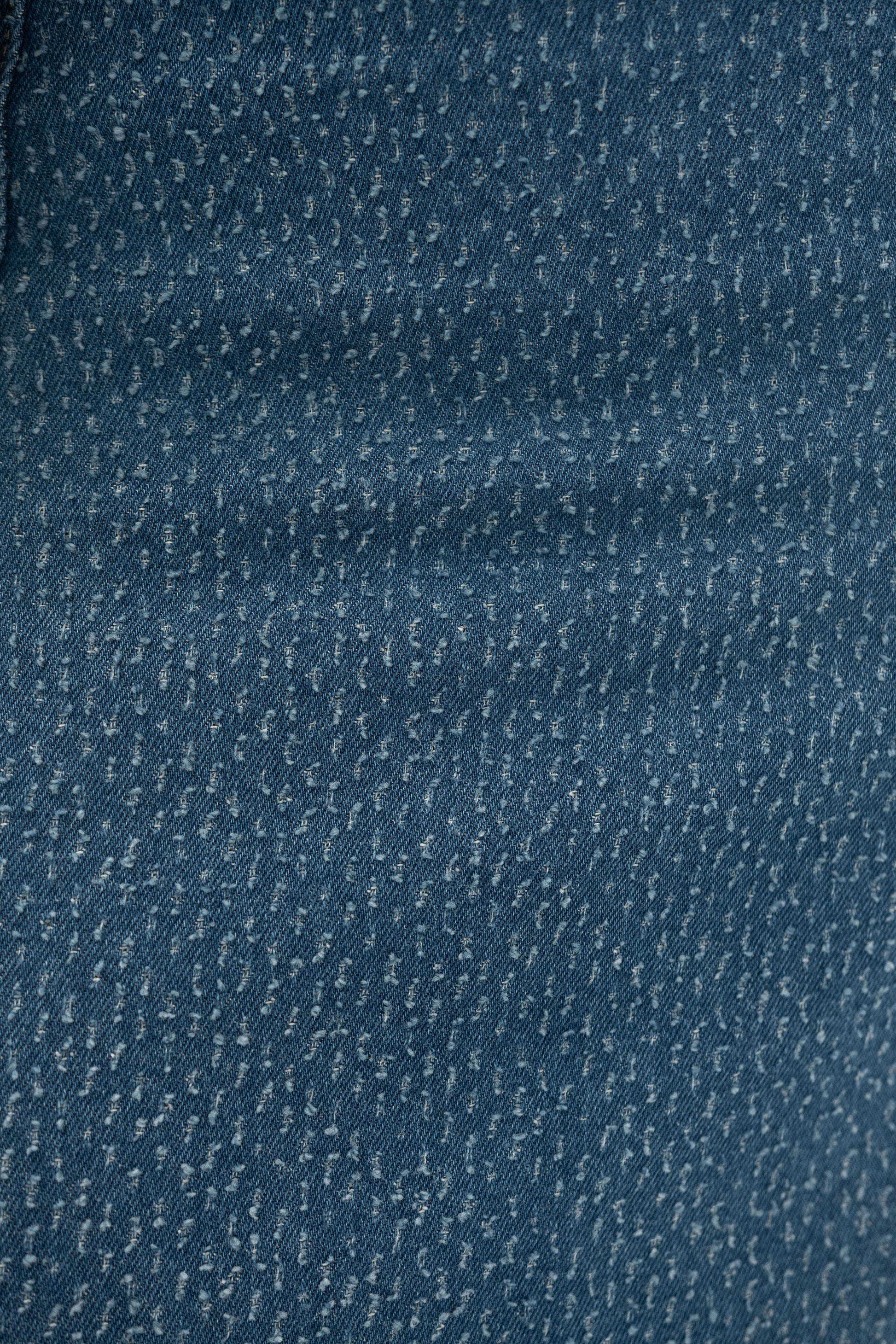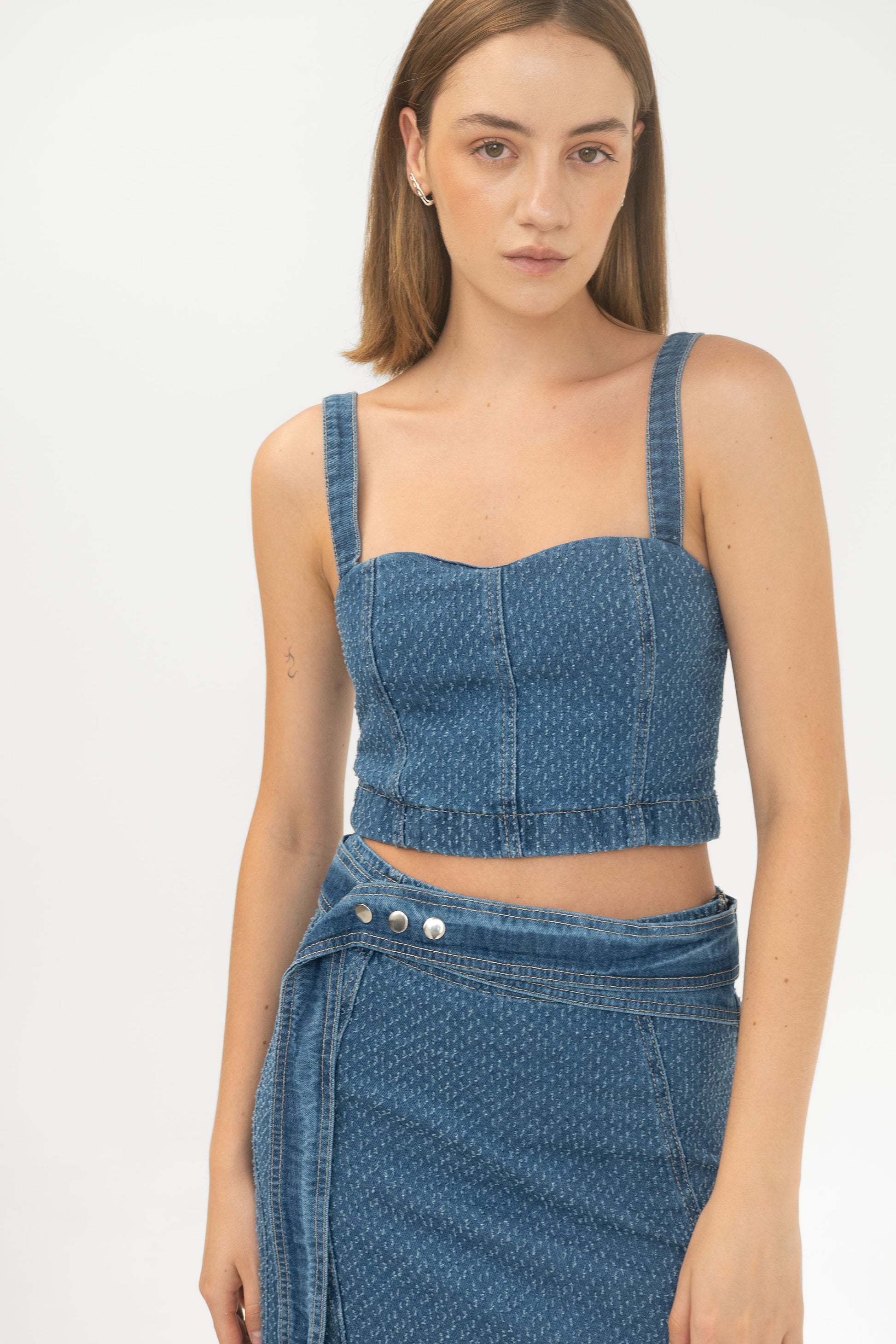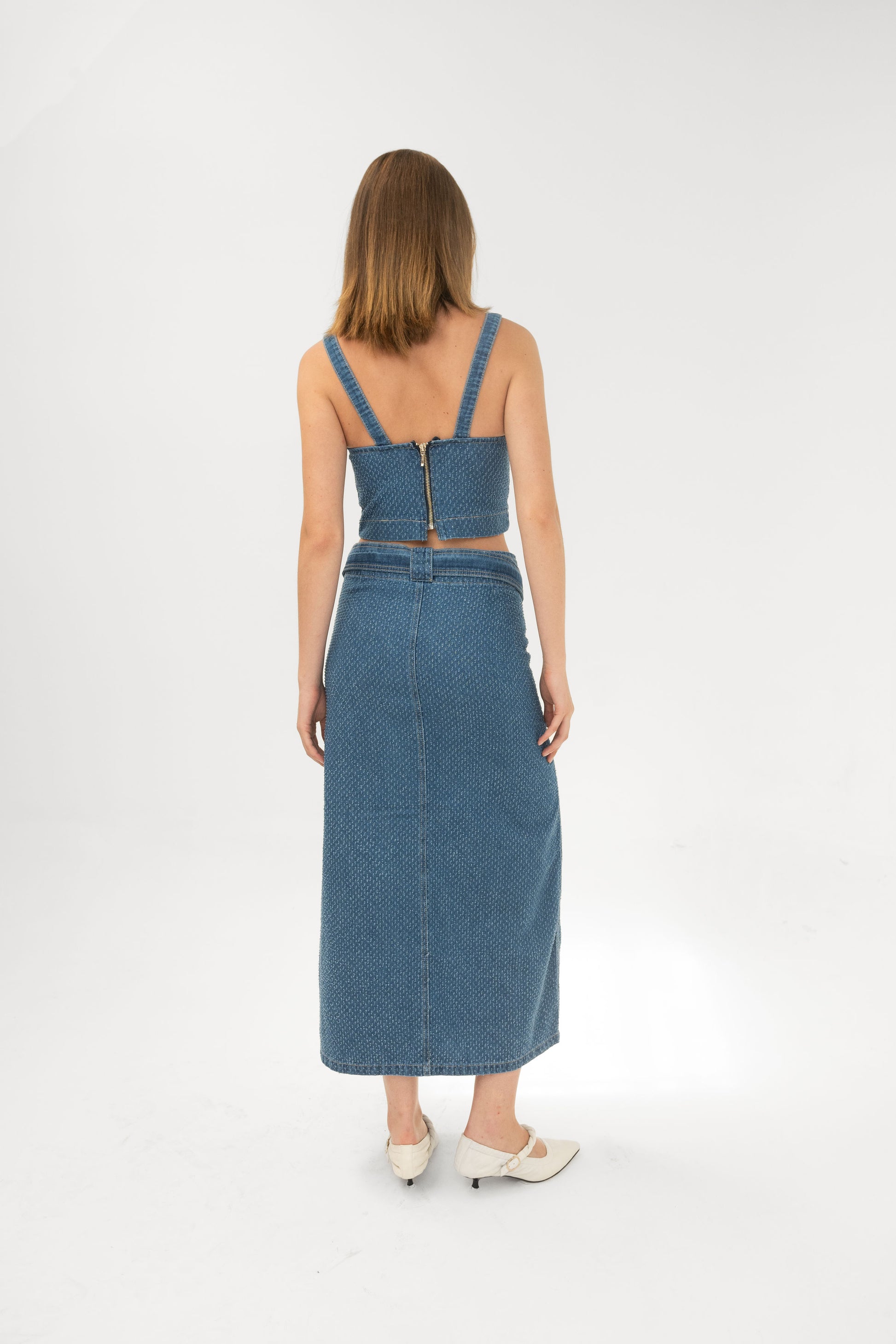 | Set de falda y top en jean con efecto láser. La falda tiene una apertura en la pierna derecha y un cinturón cruzado que define la cintura y resalta el diseño. El top presenta escote tipo corazón, tiras y cremallera en la parte posterior. La modelo usa Talla S. |