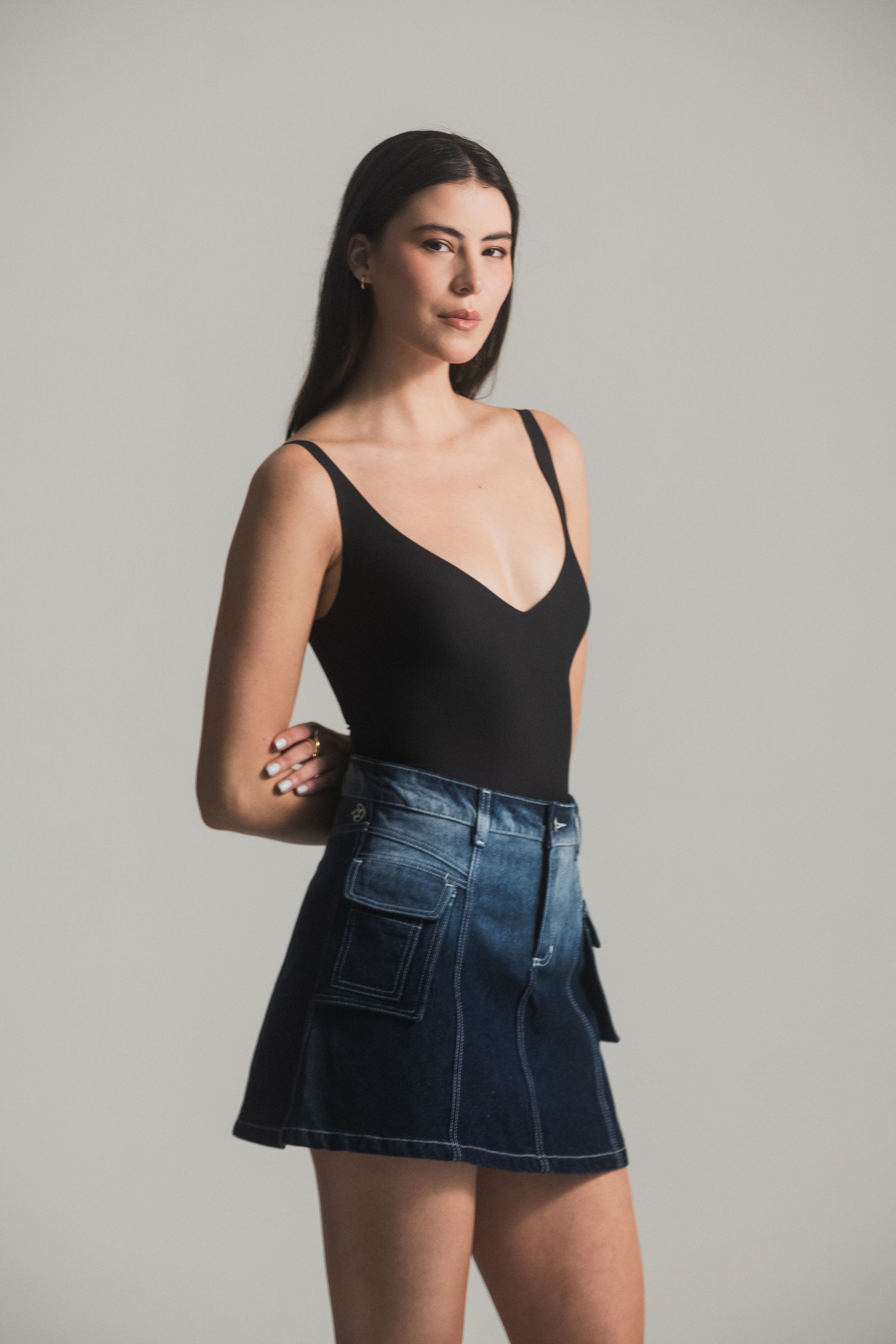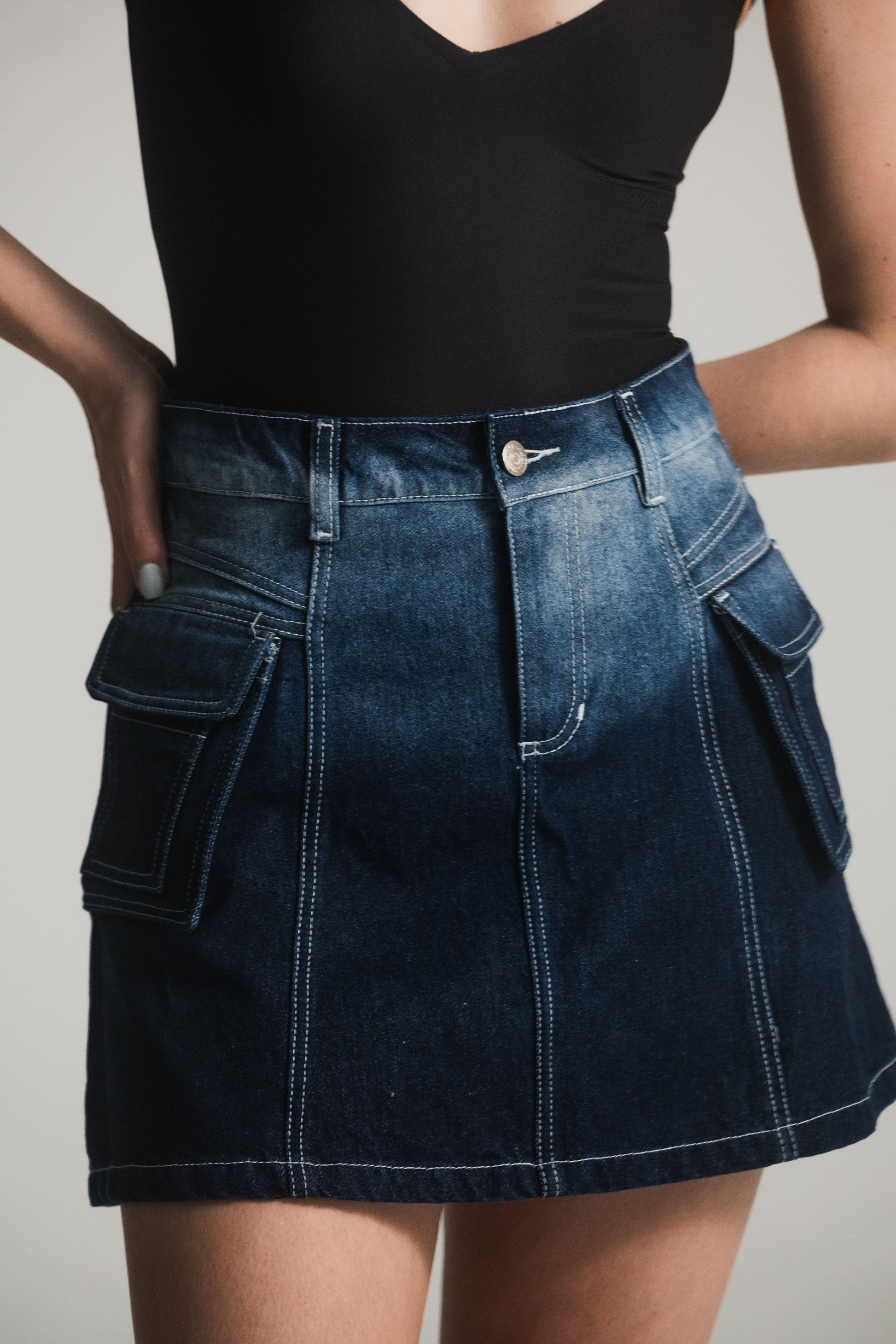 Mini falda en denim azul degradé, confeccionada en 100% algodón. Su diseño cuenta con bolsillos delanteros funcionales.