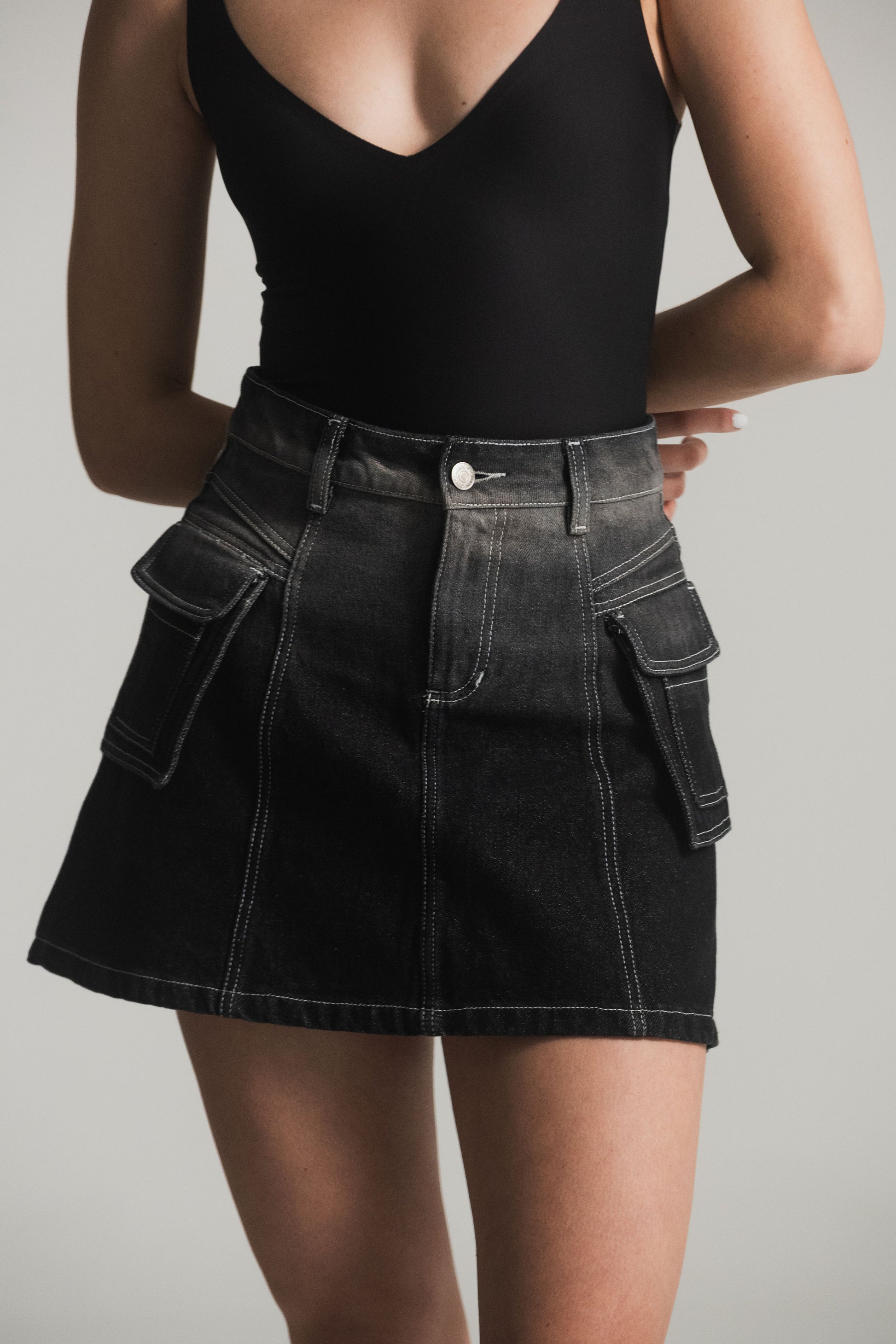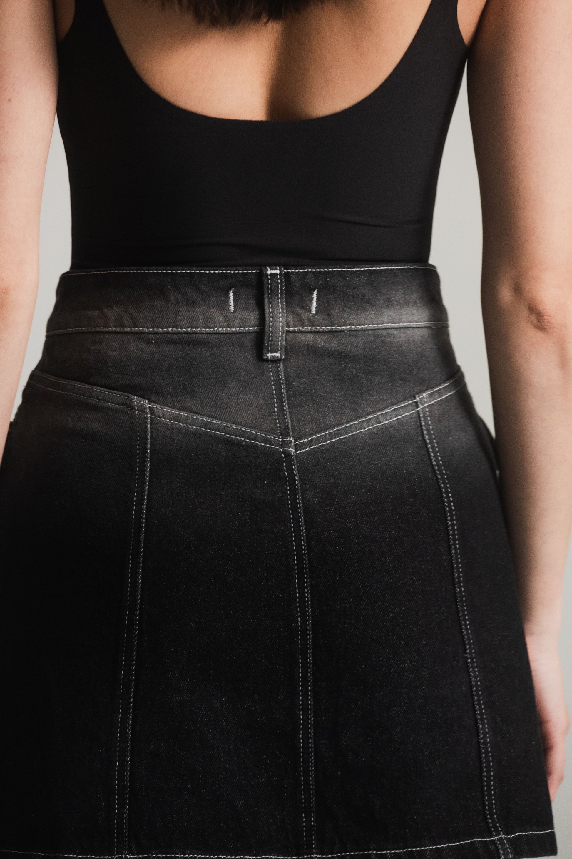 Mini falda en denim negro degradé, confeccionada en 100% algodón. Su diseño cuenta con bolsillos delanteros funcionales.