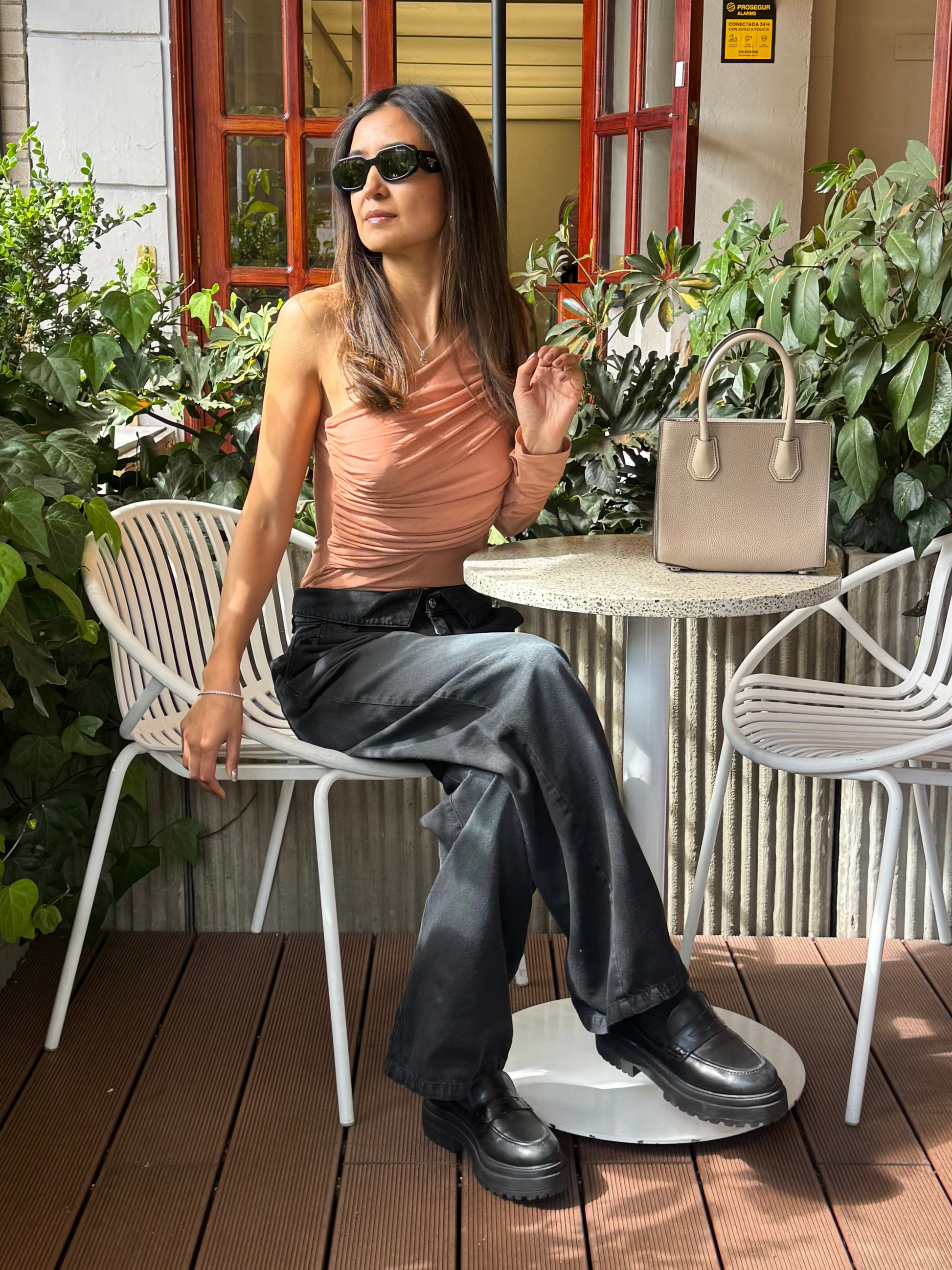 Mesh nude con recogido frontal y manga larga con detalle para el dedo.