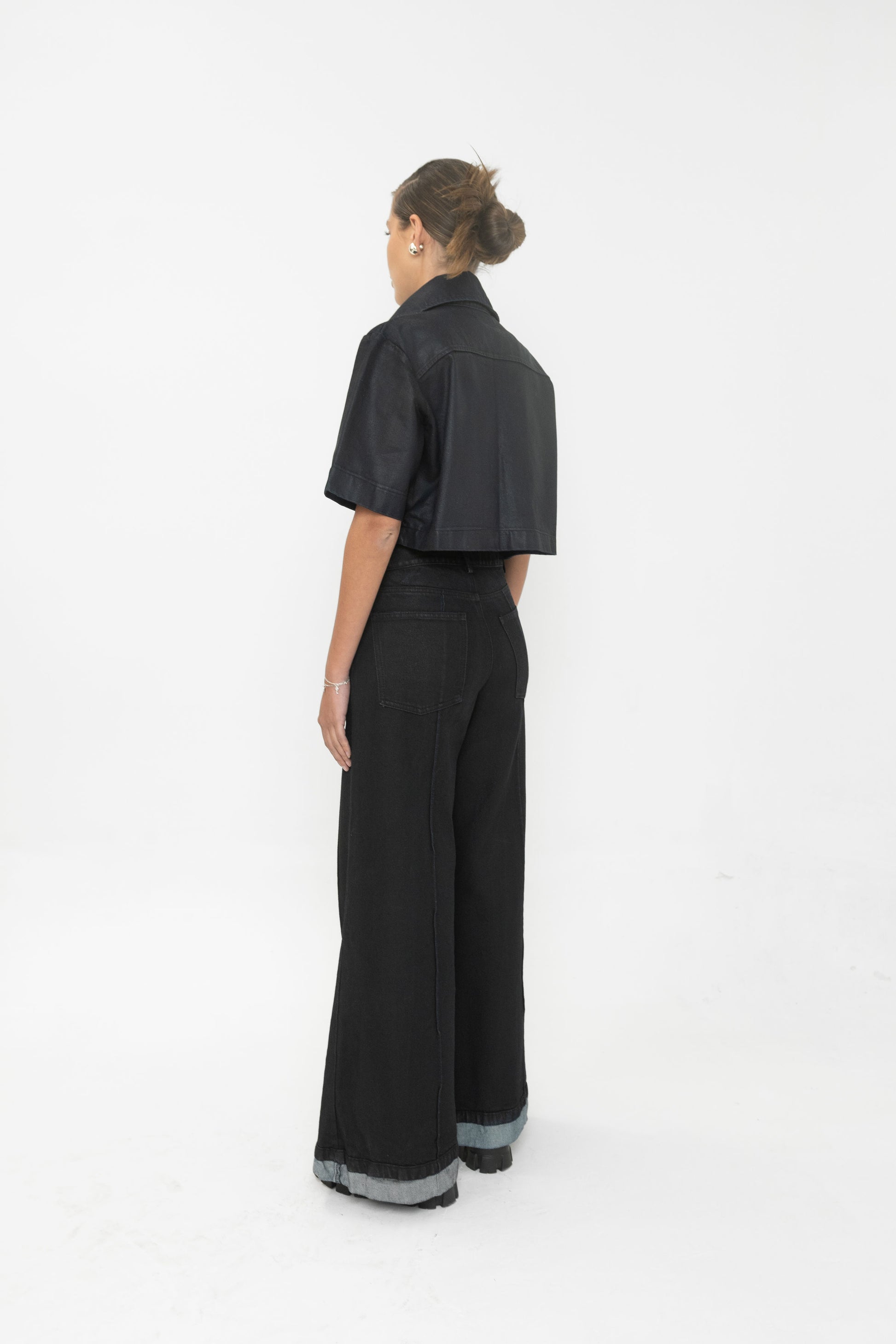 | Jean tipo sastre confeccionado en 100% algodón, con tiro medio, bota recta doblada y vena marcada en la parte frontal y posterior, que aporta estructura y definición a la silueta. El acabado encerado en tono negro le da un efecto cuero elegante, convirtiéndolo en una prenda unica. La modelo usa Talla S. |