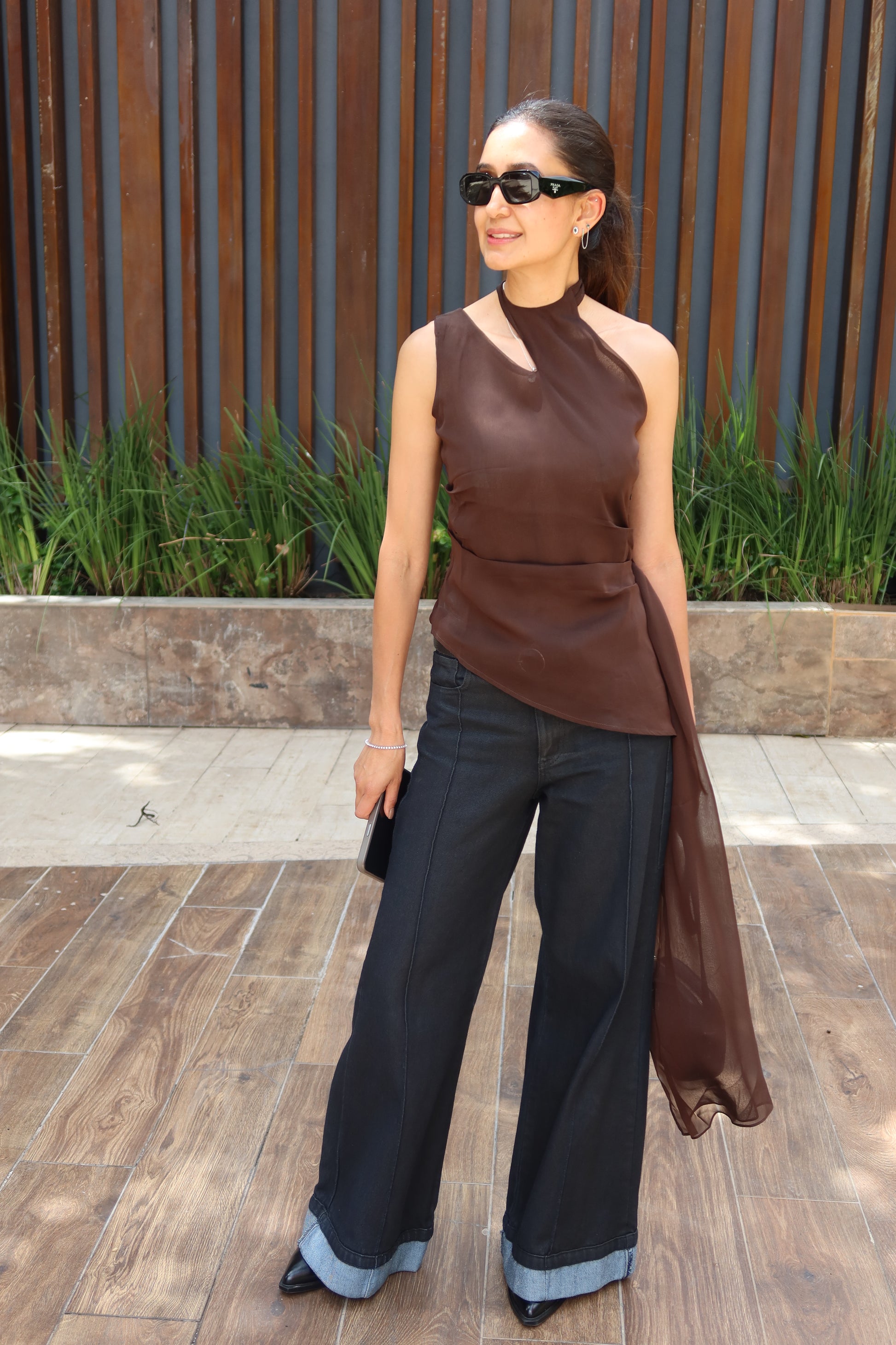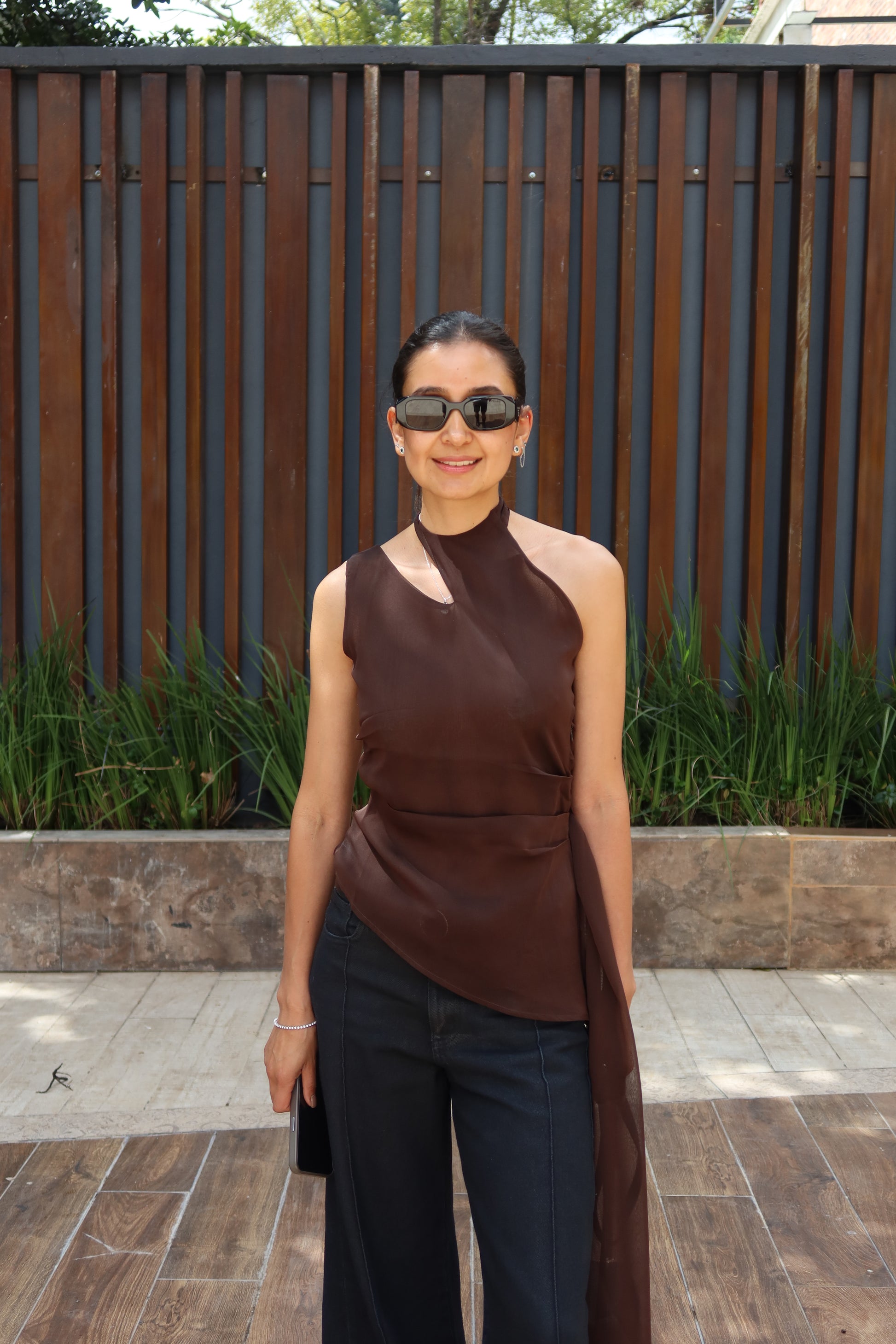 Blusa café en velo, ligera y elegante. Tiene estola larga integrada desde el cuello, que aporta movimiento y un toque sofisticado. Manga sisa y cuello estilizado para un look moderno, fresco y perfecto para cualquier ocasión.